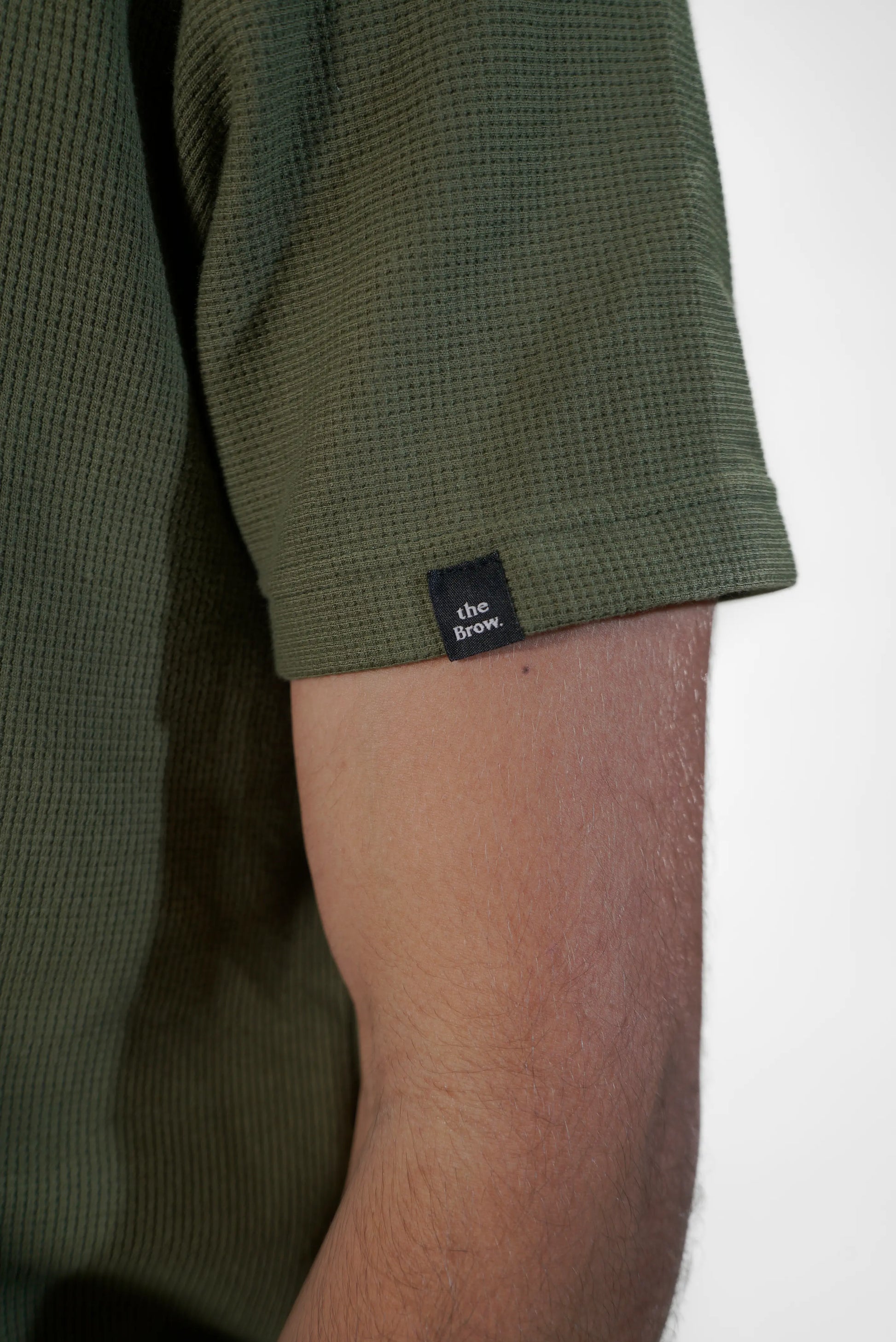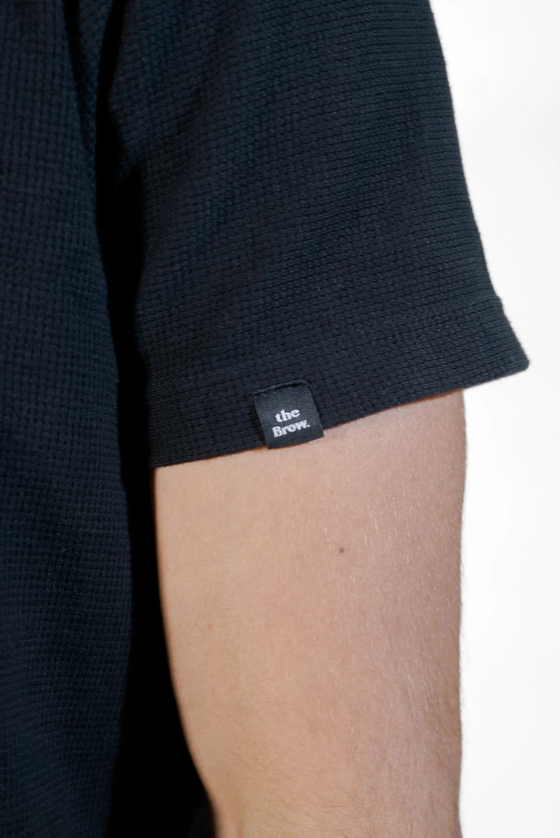 Etiqueta personalizada "the Brow." aplicada na manga